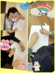 みんなで運筆練習。クルクル、ギザギザ等好きなように手を動かし、時にはテーブルへはみ出してしまい「あぁ〜」😱 なんてハプニングも笑いの渦となりました!